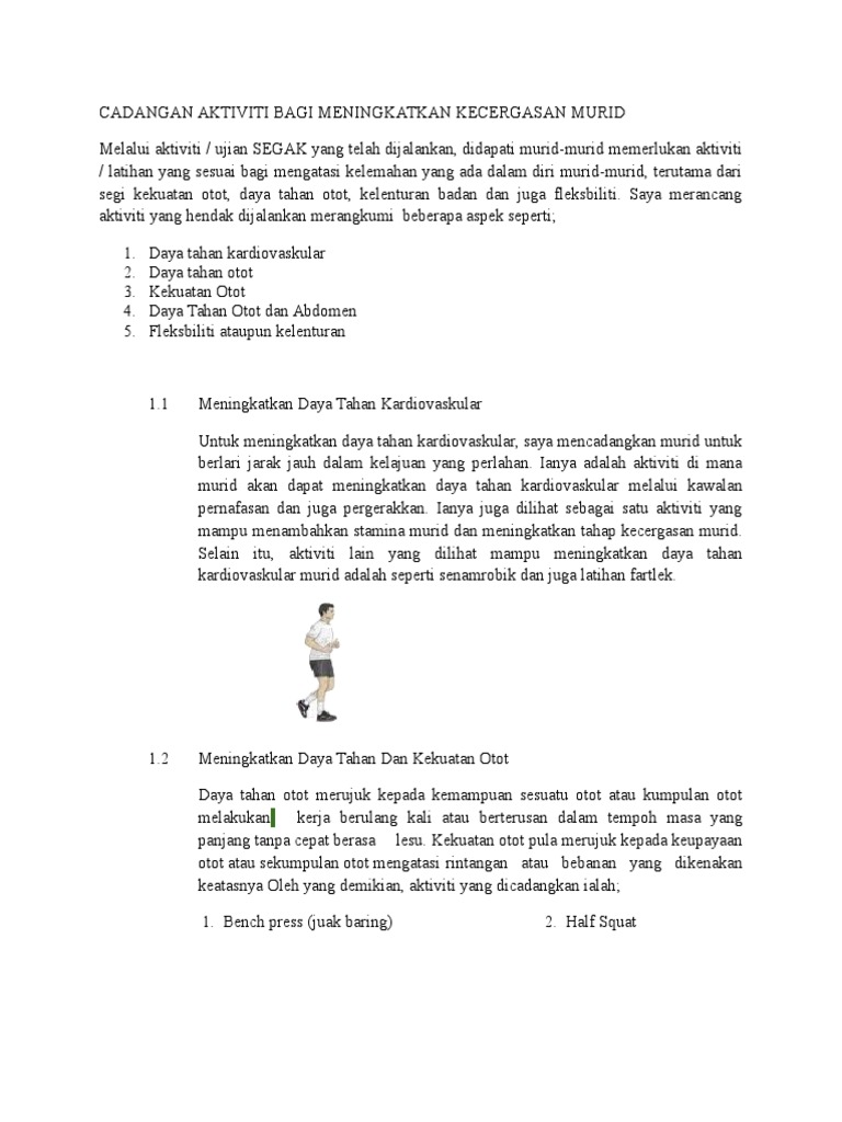 5) daya tahan otot adalah kernampuan seseorang dalam mempergunakan kelompok ototnya untuk berkontraksi terus menerus dalam waktu yang relatif cukup larna. Latihan ini adalah satu sistem latihan daya tahan kardiovaskular yang berkonsepkan pelbagai kelajuan seperti berjalan pantas, lari pecut, berjoging dan berlari dalam kelajuan sederhana. Daya tahan kardiovasukular bermaksud kemampuan dan kecekapan otot jantung,saluran darah (arteri,vena dan kapilari) dan sistem pernafasan untuk membekalkan oksigen pada otot secara berterusan semasa melakukan aktiviti. Parcourse meliputi jenis aktiviti di. Apakah aktiviti untuk meningkatkan daya tahan kardiovaskular?